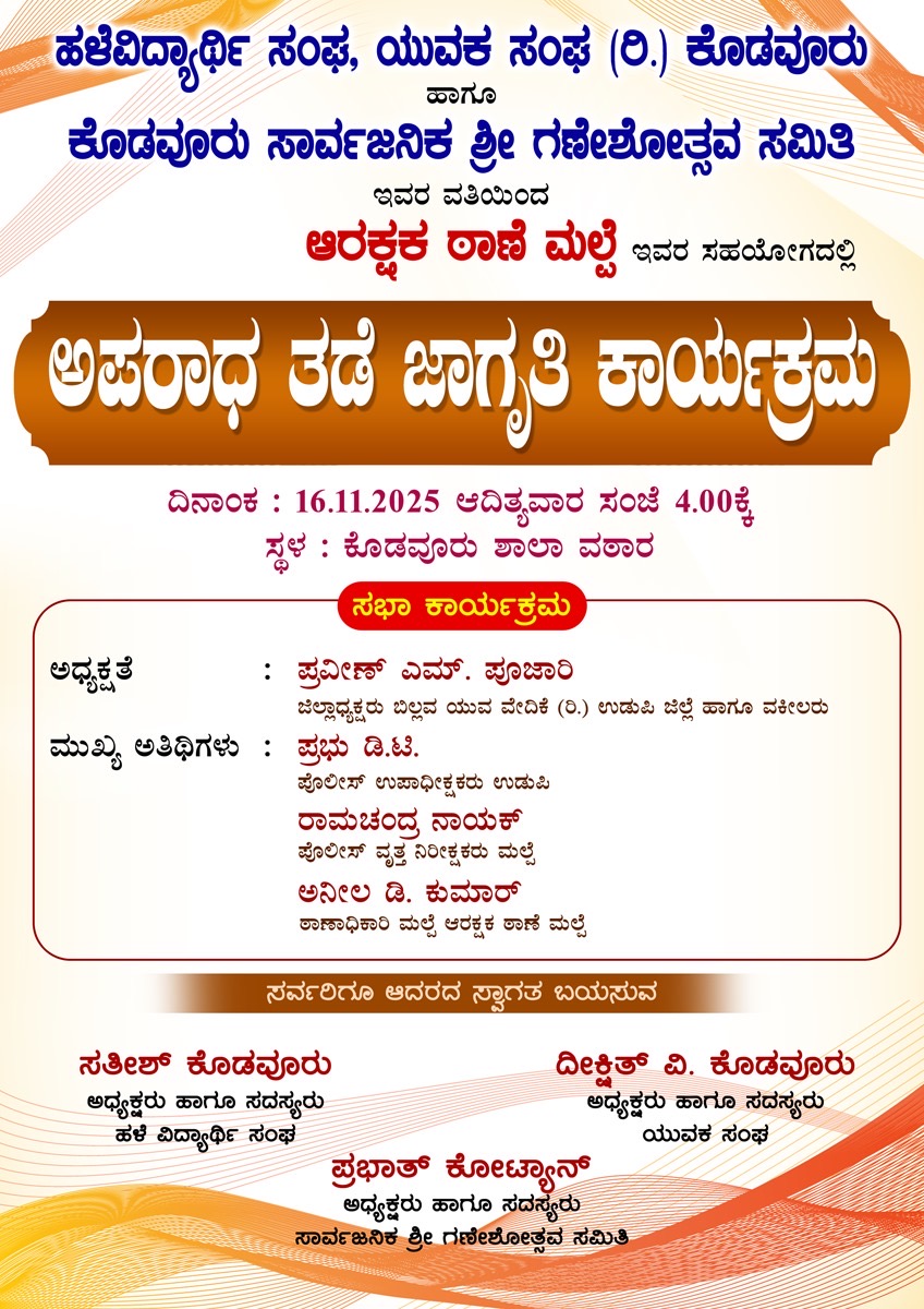 ಹಳೆ ವಿದ್ಯಾರ್ಥಿ ಸಂಘ, ಯುವಕ ಸಂಘ (ರಿ) ಕೊಡವೂರು ಹಾಗೂ ಕೊಡವೂರು ಸಾರ್ವಜನಿಕ ಶ್ರೀ ಗಣೇಶೋತ್ಸವ ಸಮಿತಿ ಇವರ ವತಿಯಿಂದ ಆರಕ್ಷಕ ಠಾಣೆ ಮಲ್ಪೆ ಇವರ ಸಹಯೋಗದಲ್ಲಿ ನವೆಂಬರ್ 16 ಆದಿತ್ಯವಾರದಂದು ಸಾಯಂಕಾಲ ಗಂಟೆ 4.00ಕ್ಕೆ ಕೊಡವೂರು ಶಾಲಾ ವಠಾರದಲ್ಲಿ ಅಪರಾಧ ತಡೆ ಜಾಗೃತಿ ಕಾರ್ಯಕ್ರಮ ಆಯೋಜಿಸಲಾಗಿದೆ